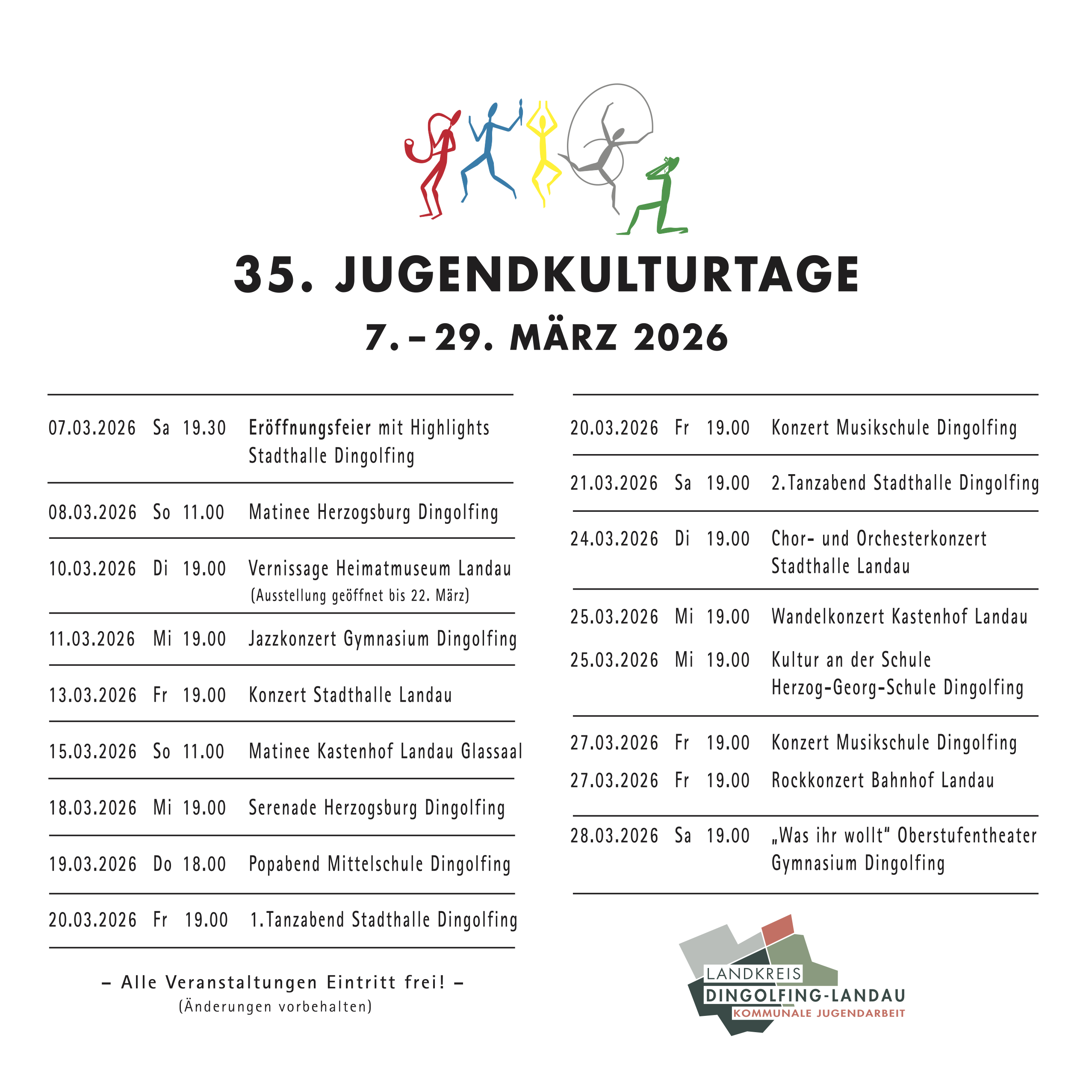 Wer nach diesem Abend oder generell Lust auf mehr hat, kann eine der 16 weiteren Veranstaltungen bis zum 28. März besuchen. Freuen darf man sich unter anderem auf das bewährte Jazzkonzert im Gymnasium Dingolfing, das Chor- und Orchesterkonzert in der Stadthalle Landau sowie das Rockkonzert im Eventlokal im Bahnhof Landau. Die Herzogsburg und die Musikschule in Dingolfing sowie der Kastenhof in Landau bilden den Rahmen für zahlreiche Matineen und Serenaden mit klassischer und moderner Musik. Auch die Mittelschule Dingolfing und die Herzog-Georg-Schule werden jeweils einen eigenen Abend gestalten, und im Gymnasium Dingolfing kommen die Freunde des Theaters auf ihre Kosten. Die Veranstaltungen mit den meisten Mitwirkenden sind die beiden Tanzabende am 20. und 21. März in der Stadthalle Dingolfing, bei denen 27 verschiedene Tanzgruppen mit knapp 400 Tänzerinnen und Tänzern das Ergebnis ihrer intensiven Proben zeigen.