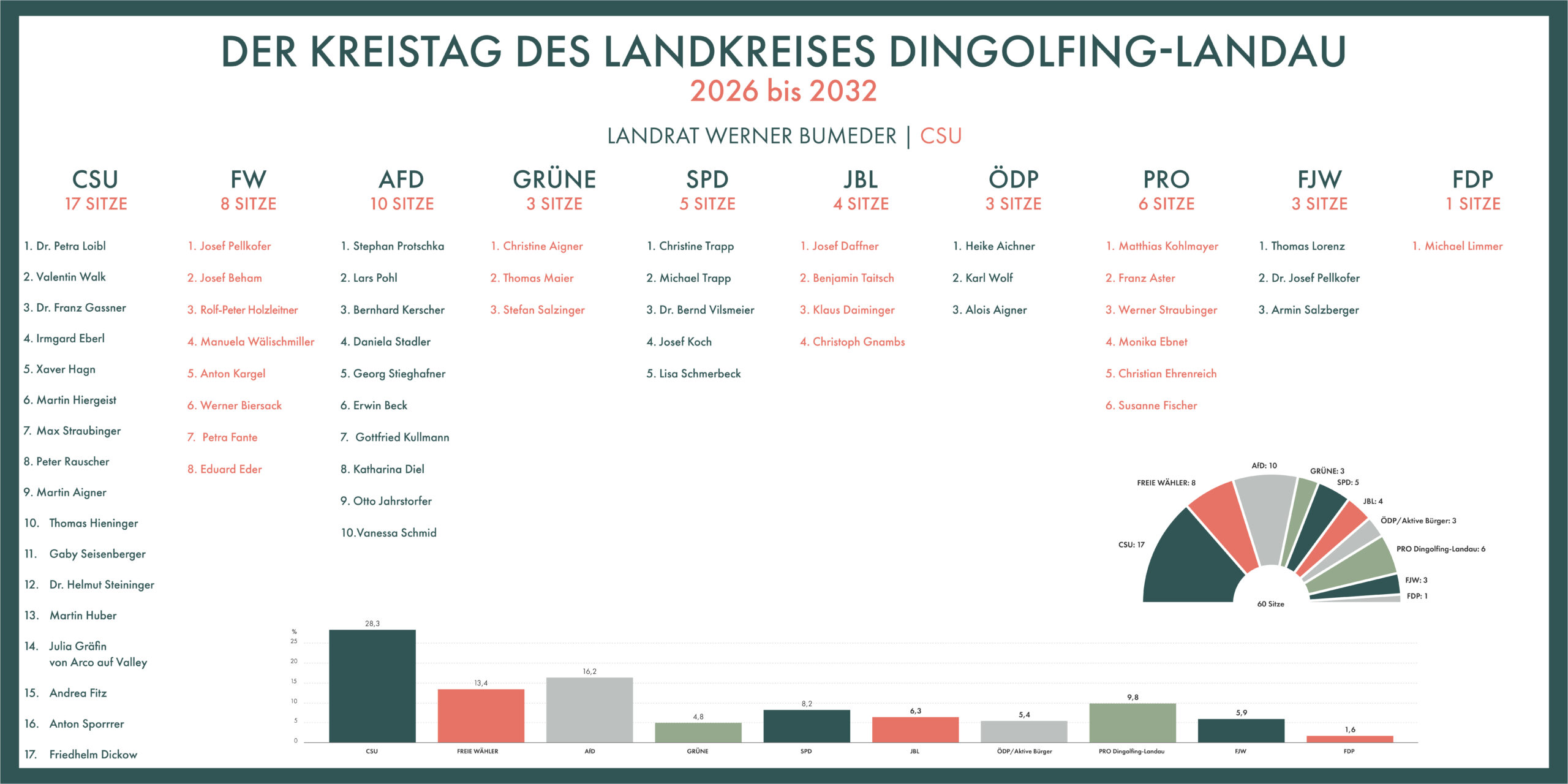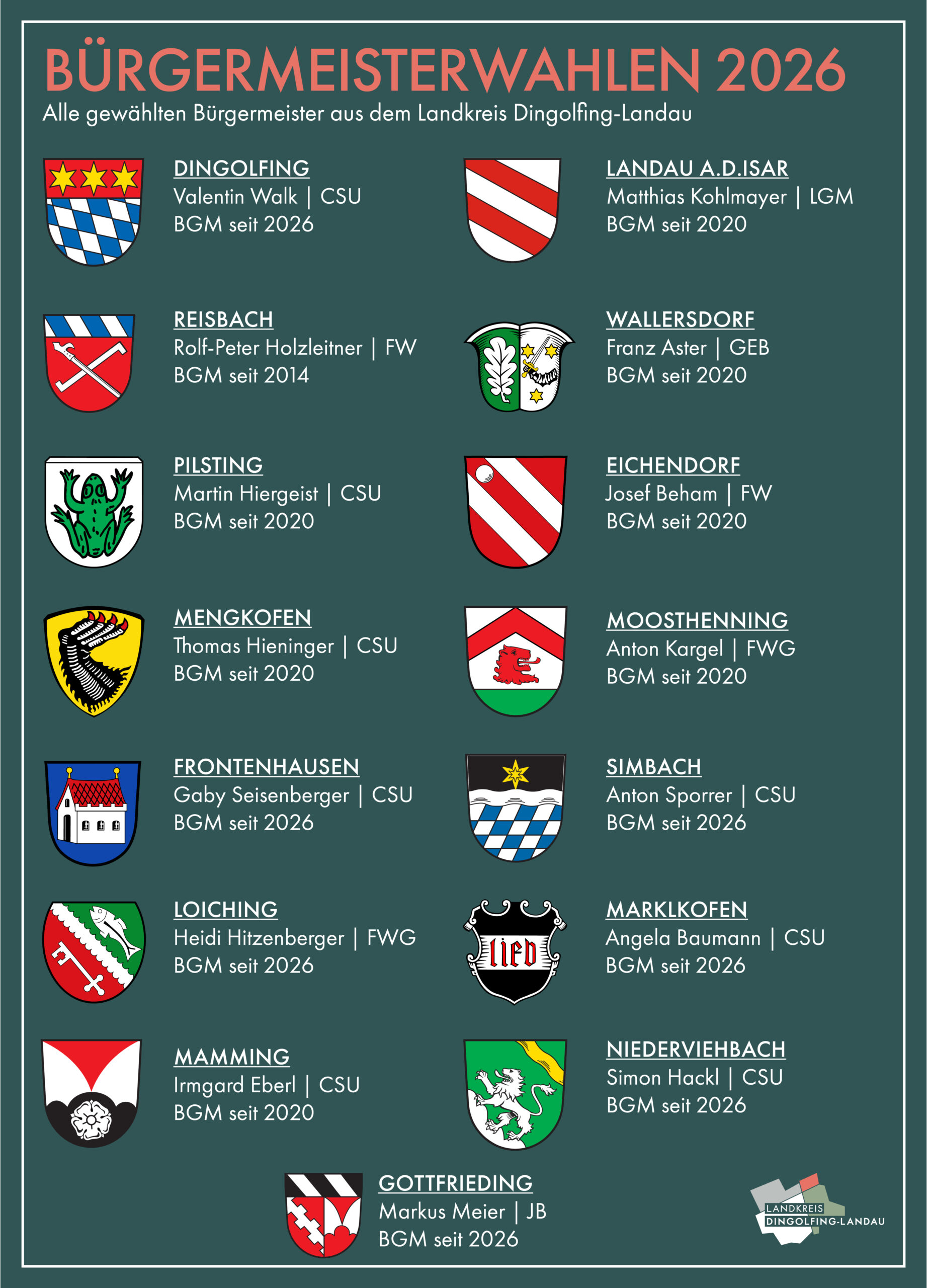 Die Bürgerinnen und Bürger des Landkreises Dingolfing-Landau haben im Rahmen der Kommunalwahl 2026 einen neuen Kreistag gewählt. Für die kommende Amtsperiode von 2026 bis 2032 gehören dem Gremium insgesamt 60 Kreisrätinnen und Kreisräte an.