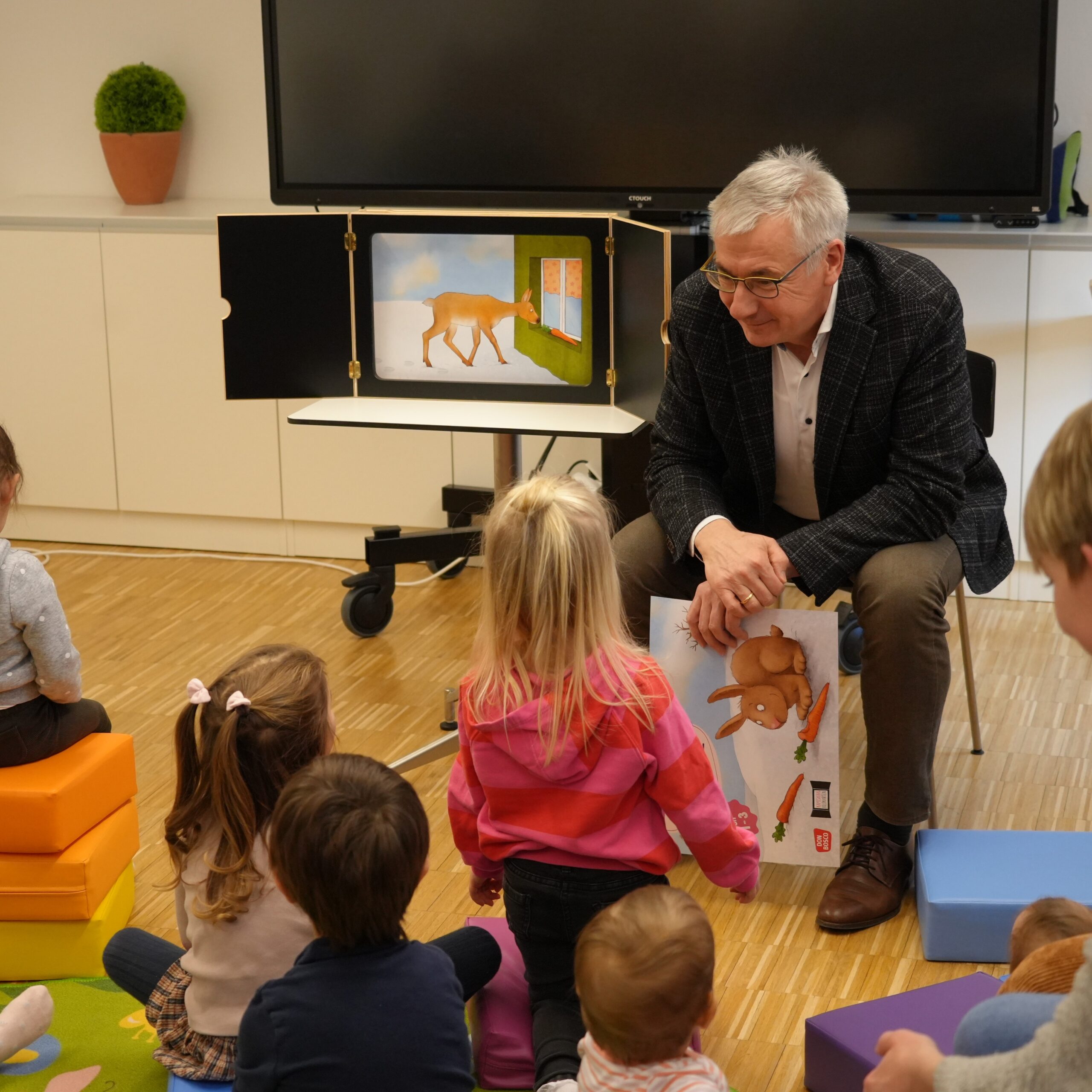 In gemütlicher Atmosphäre las der Landrat das Märchen „Das Häschen und die Rübe“ vor. Dabei kam das japanische Erzähltheater Kamishibai zum Einsatz: Die passenden Illustrationen wurden auf einer kleinen Theaterbühne präsentiert, wodurch die Lesung fast den Charakter einer kleinen Theatervorführung erhielt. Mit viel Einfühlungsvermögen bezog Landrat Bumeder die Mädchen und Buben aktiv in die Geschichte ein, stellte Fragen, schaute zusammen mit ihnen die Bilder an und sorgte so für Aufmerksamkeit und Begeisterung bei den kleinen Zuhörerinnen und Zuhörern.
