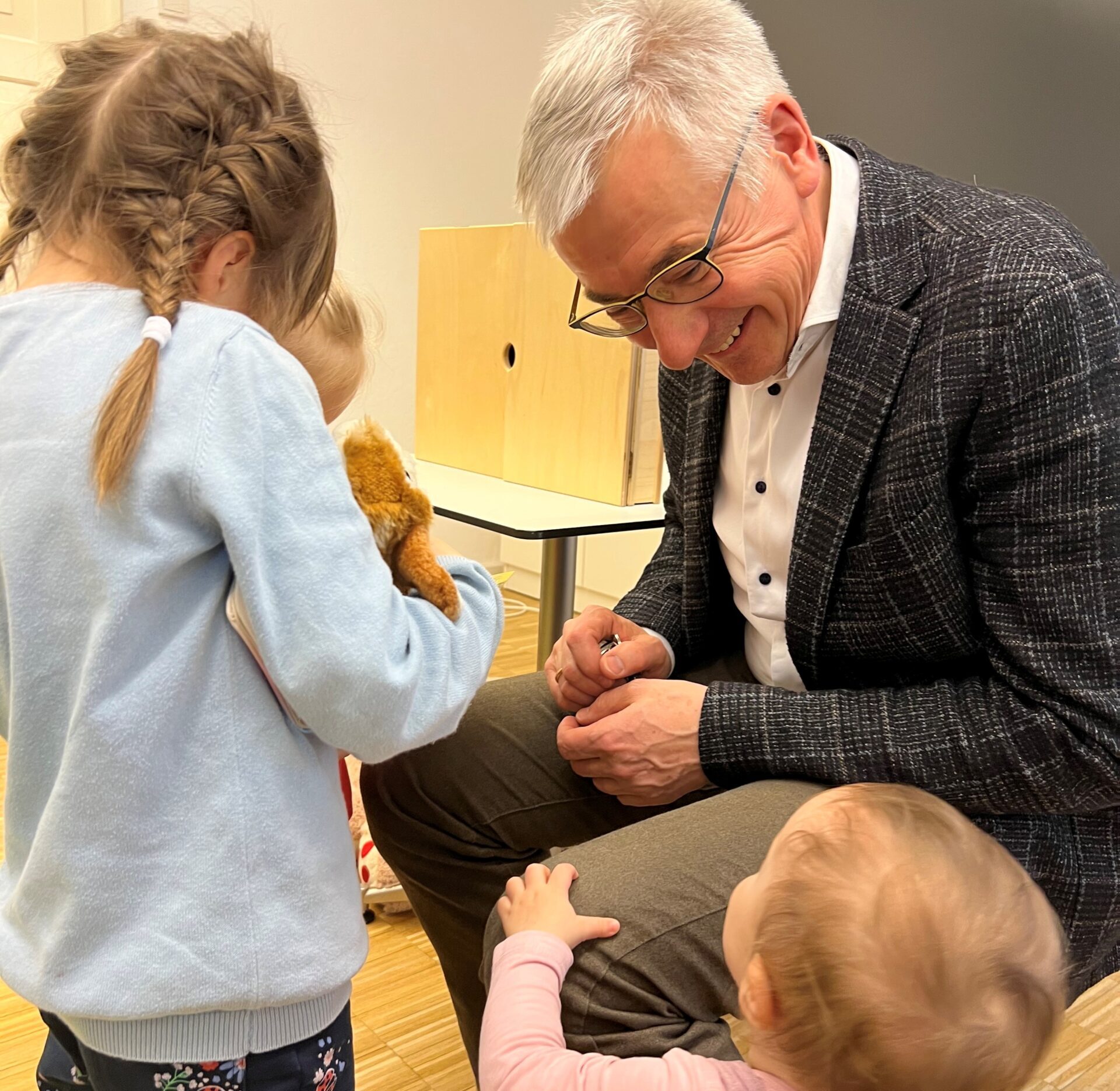 Auch nach dem Vorlesen blieb der Landrat noch bei den Kindern, spielte mit ihnen und kam mit den älteren Kindern ins Gespräch. Parallel nutzten Eltern und Großeltern die Gelegenheit, sich mit den Mitarbeiterinnen der „KoKi – Frühe Hilfen“ auszutauschen. Teresa Lux, Evelyn Billinger und Martina Baierl vom Familienbüro informierten über die vielfältigen Unterstützungsangebote für Familien im Landkreis, wie etwa Elterncoaching, Beratung und weitere Hilfen in der frühen Lebensphase von Kindern.