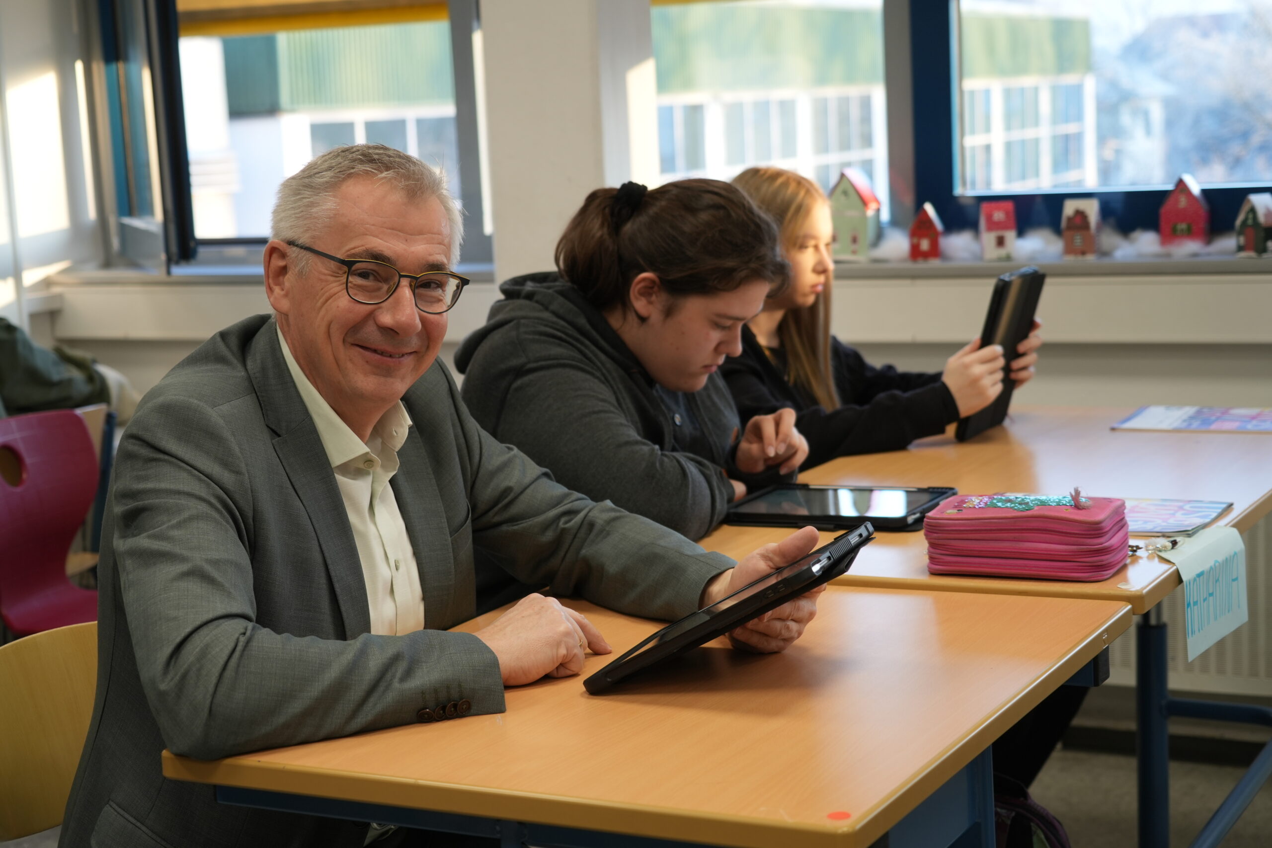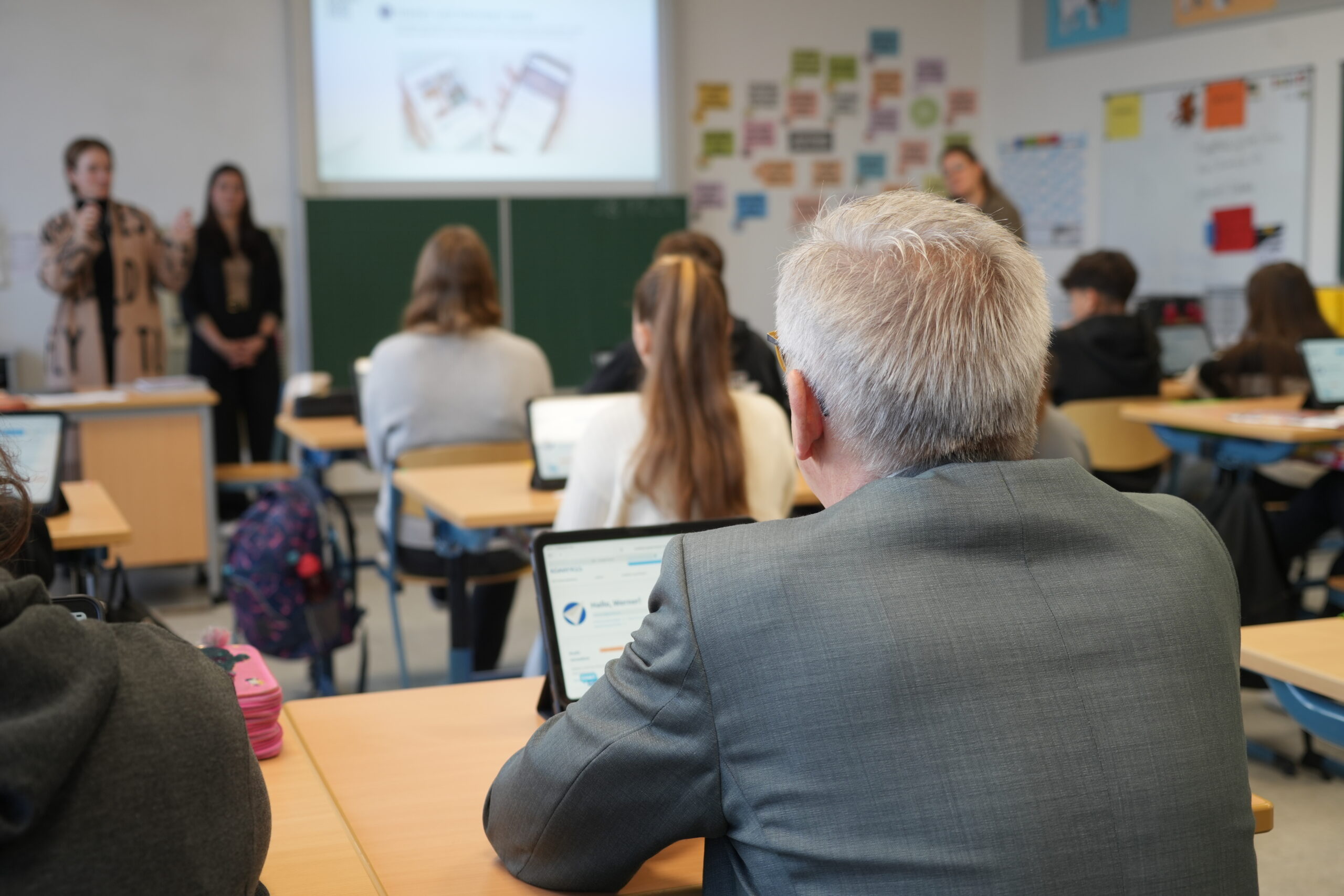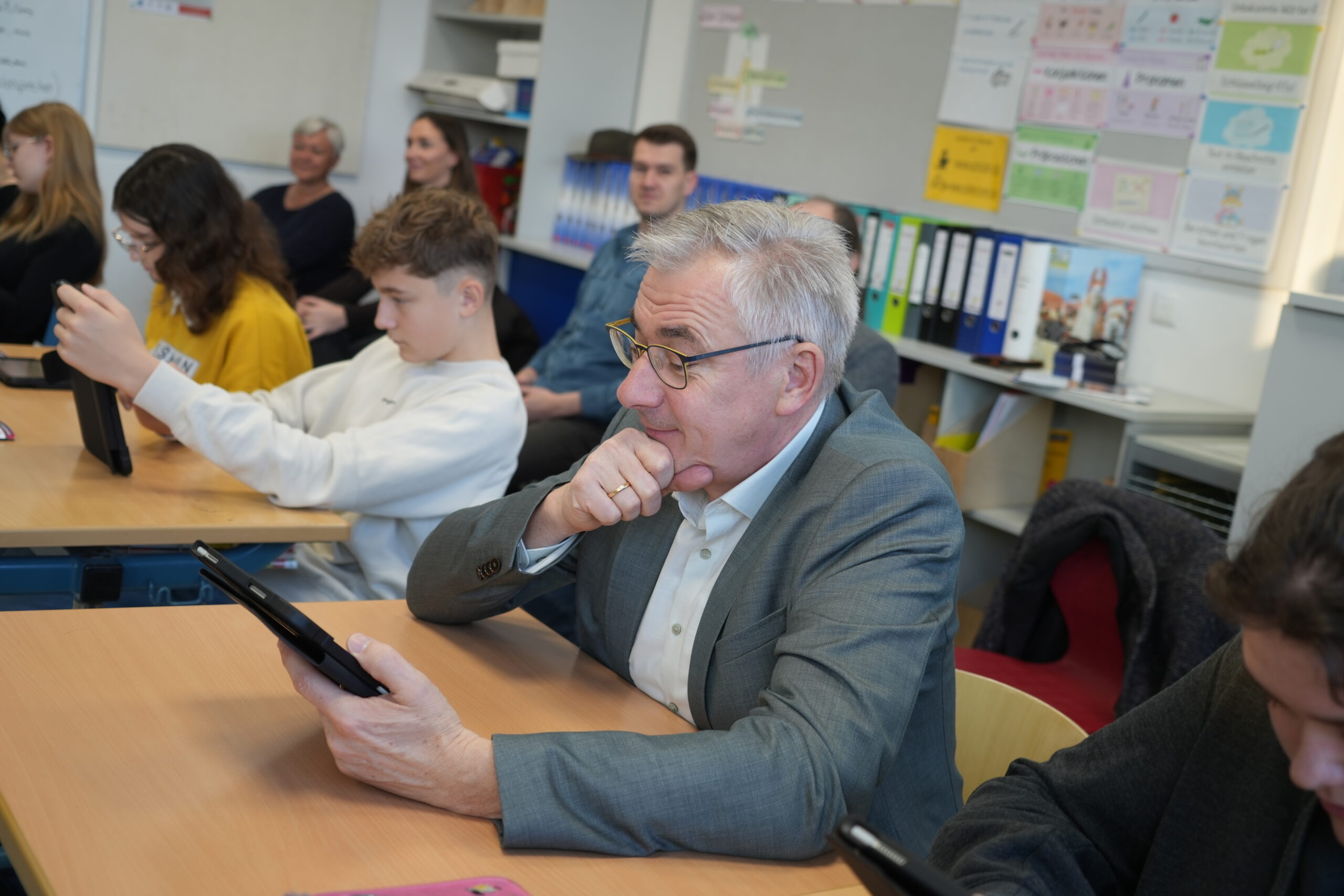 Ein ungewöhnlicher Anblick hat sich am Freitag an der Maximus-von-Imhof-Mittelschule Reisbach geboten: Zwischen den Schülerinnen und Schülern der 9b saß Landrat Werner Bumeder — höchst konzentriert vor dem Bildschirm. Der Grund: Der digitale Ausbildungskompass war zu Gast und der Landrat wollte selbst erleben, wie das Tool Jugendliche bei ihrer Berufsorientierung unterstützt. Auch Bürgermeister Rolf-Peter Holzleitner ließ sich die Gelegenheit nicht entgehen, den Kompass zu testen. Beide waren beeindruckt, wie anschaulich das Tool die Berufswahl unterstützt.